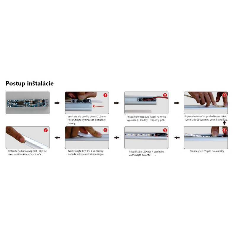 Vypínač LED dotykový KM-VDS-05L, 12V-36W, 24V-72W. Elektrický obvod zapnete/vypnete dotykem na libovolném místě hliníkové lišty ve které je instalován LED pás s tímto vypínačem. Vhodný pro montáž do hliníkových profilů. Delším dotykem můžete nastavit intenzitu osvětlení v rozmezí 6% až 100%. Vypínač má funkci paměti.