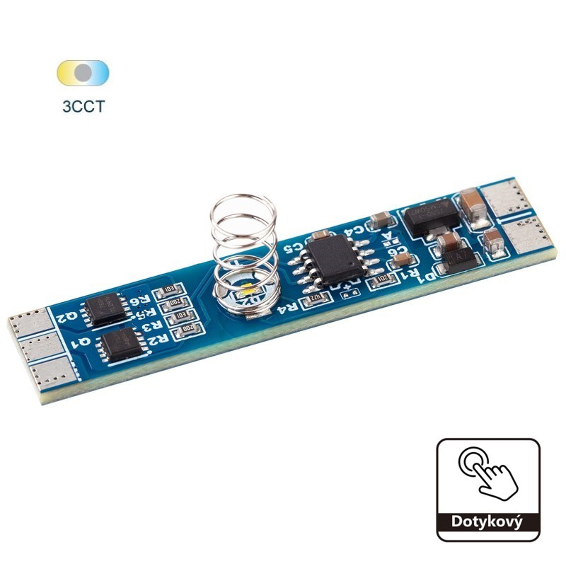 Vypínač LED dotykový KM-VDS-06L, 12V-96W, 24V-192W CCT stmievateľný. Vypínačom zapnete/vypnete elektrický obvod, nastavíte farbu svetla CCT teplá-neutrálna-studená, dlhším dotykom môžete nastaviť intenzitu osvetlenia v rozmedzí 6% až 100%. Vypínač má funkciu pamäte. Vhodný pre montáž do hliníkových profilov.