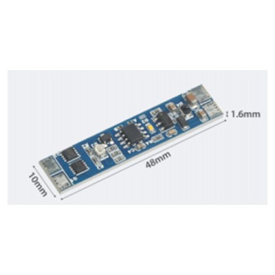 Vypínač LED bezdotykový stmievateľný KM-VBS-04L RF 8-10CM 12V-96W, 24V-192W. Detekčná vzdialenosť vypínača je 8-10cm. Pohybom ruky v detekčnej zóne vypínača zapnete/vypnete elektrický obvod. Pridržaním ruky v detekčnej zóne vypínača nastavíte intenzitu osvetlenia. Vhodný pre montáž do hliníkových profilov. RF prenos - vypínač môže byť umiestnený pod difúzorom.