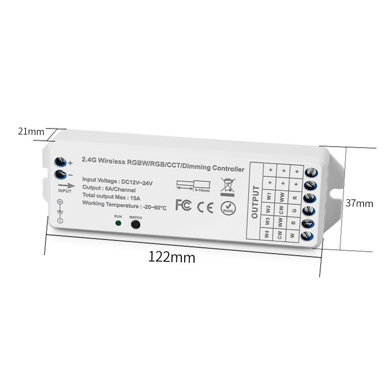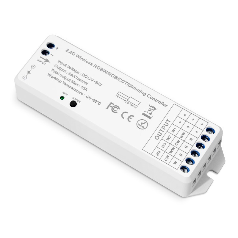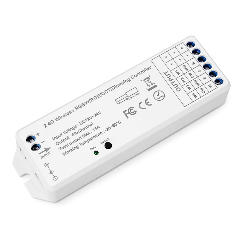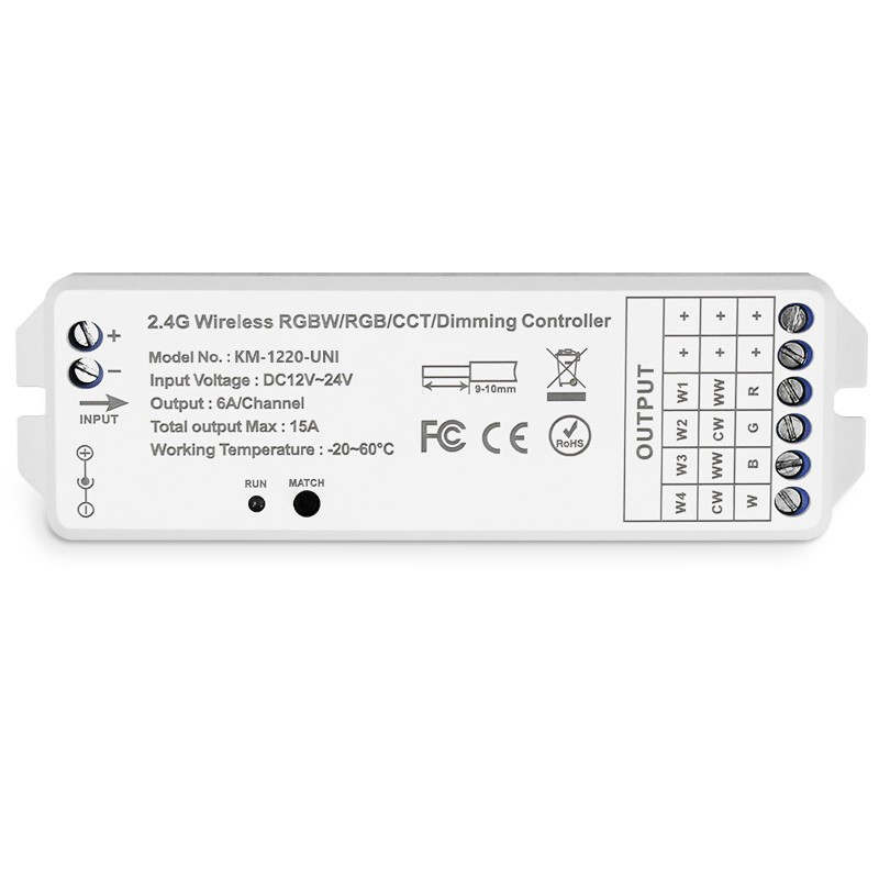 Prijímač univerzálny KM-1220-UNI, 12V-180W, 24V-360W s RF prenosom, s napájacím napätím/výkonom 12V/180W 24V/360W určený pre ovládanie jednofarebných, CCT, RGB, RGBW LED pásov. Prijímač je kompatibilný s ovládačmi KM-W-UNI-1 obj. kód 38134561 - pre jednofarebné LED pásy, KM-CCT-UNI-2 obj. kód 38134562 - pre CCT LED pásy, KM-RGB-UNI-3 obj. kód 38134563 - pre RGB LED pásy a KM-RGBW-UNI-4 obj. kód 38134564 - pre RGBW LED pásy. Prijímač je nastavený na univerzálnu frekvenciu pri ktorej reaguje na všetky uvedené ovládače, ak ho spárujeme pomocou párovacieho tlačítka s konkrétnym diaľkovým ovládačom na iné už nebude reagovať.