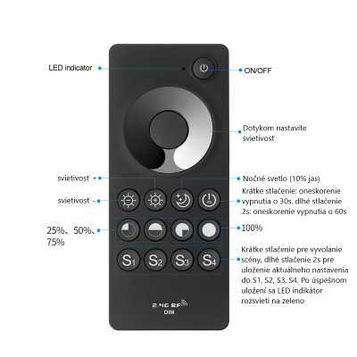 Stmievač ovládač KM-W-UNI-1 obj. kód 38134561 s RF prenosom, určený pre ovládanie jednofarebných LED pásov. Ovládač je kompatibilný s prijímačom KM-1220-UNI obj. kód 38134550 12V/180W 24V/360W. Prijímač je nastavený na univerzálnu frekvenciu pri ktorej reaguje na všetky ovládače, ak ho spárujeme pomocou párovacieho tlačítka s konkrétnym diaľkovým ovládačom na iné už nebude reagovať. Pomocou tohto ovládača môžete LED pás zapnúť/vypnúť, plynule meniť intenzitu osvetlenia, nastaviť nočný režim - 10% svietivosti, nastaviť svietivosť priamo pomocou tlačidiel na 25%, 50%, 75%, 100%, nastaviť vypnutie s oneskorením 30s a 60s a uložiť do pamäte S1, S2, S3, S4 štyri rôzne nastavenia. Súčasťou balenia je držiak ovládača do ktorého sa môž