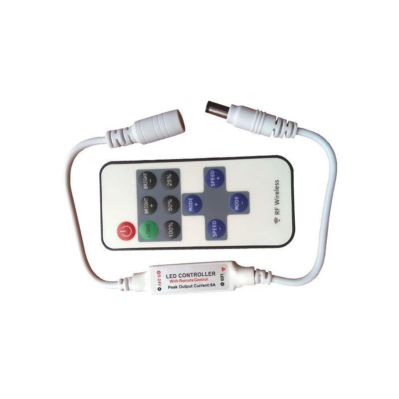 Stmívač KM-W-02, 6A 12V/72W 24V/144W RF, slouží ke stmívání jednobarevných LED pásů s možností nastavení intenzity světla a spuštění dynamických programů. Stmívač se ovládá pomocí dálkového ovladače. Přenos signálu je radiofrekvenční.