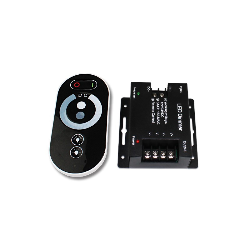 Stmívač KM-W-06, 20A 12V/240W 24V/480W RF, slouží ke stmívání jednobarevných LED pásů s možností zapnout/vypnout a nastavit intenzitu světla. Stmívač se ovládá pomocí dálkového ovladače. Přenos signálu je radiofrekvenční.