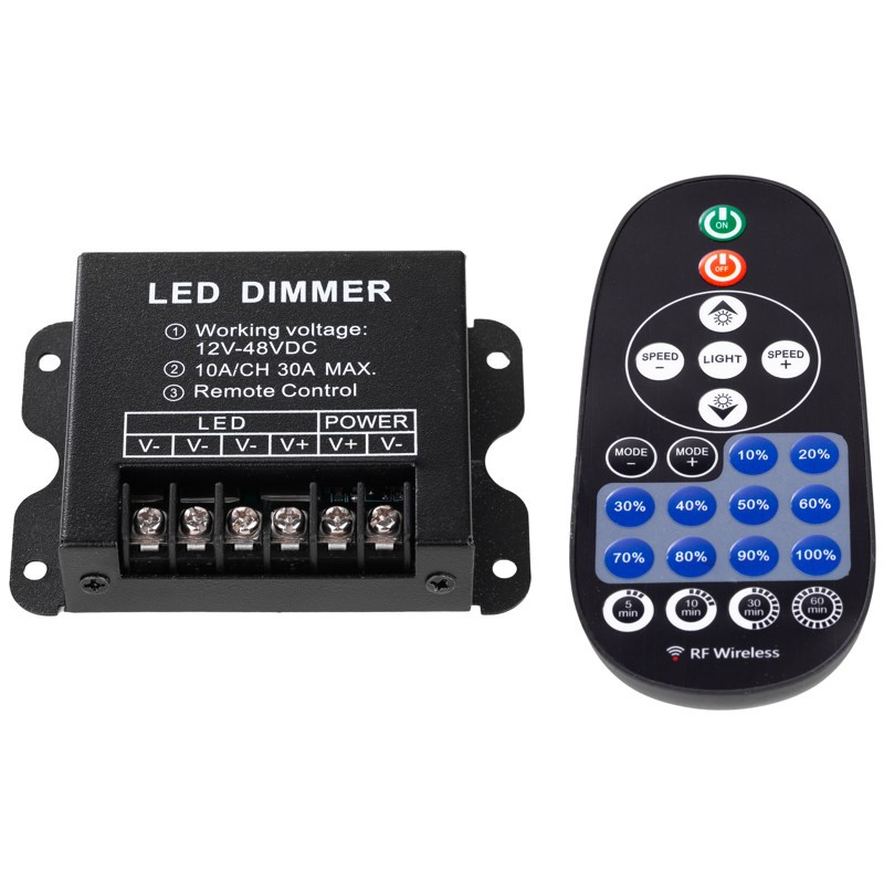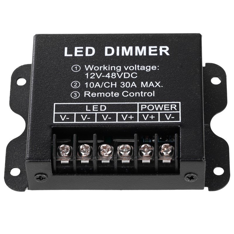 Stmívač KM-W-15, se vstupním/výstupním napětím DC 12-48V, proudem 30A, vhodný pro ovládání jednobarevných LED pásů s možností nastavení intenzity světla. Stmívač se ovládá pomocí dálkového ovladače. Přenos signálu je radiofrekvenční.
