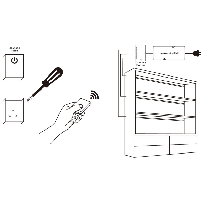 Stmievač prijímač KM-W-PS-1, 12V/24V 120W obj. kód 38443541 s RF prenosom, napájacím napätím 12V/24V určený pre použitie s napájacími zdrojmi SMART série KMS na separátne ovládanie jednofarebných LED pásov. Prijímač je kompatibilný s ovládačom KM-W-OD-1 obj. kód 38443545. Prijímač je potrebné spárovať s ovládačom pomocou párovacieho tlačítka.