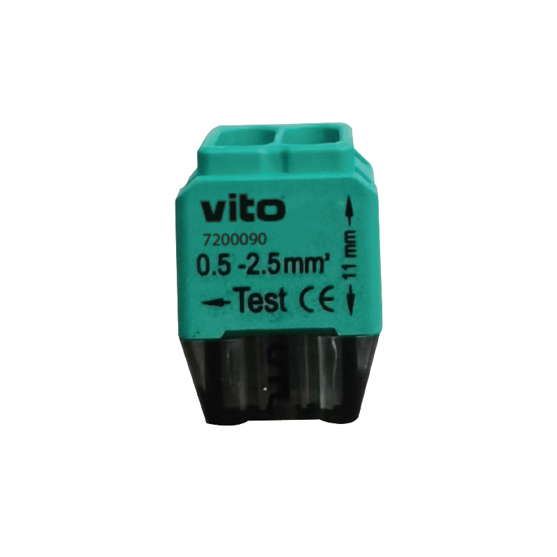 Svorka bezšroubová KM-2D-V-01, Obj. kód 73000050, která je určena pro spojení dvou vodičů nasunutím a zacvaknutím.