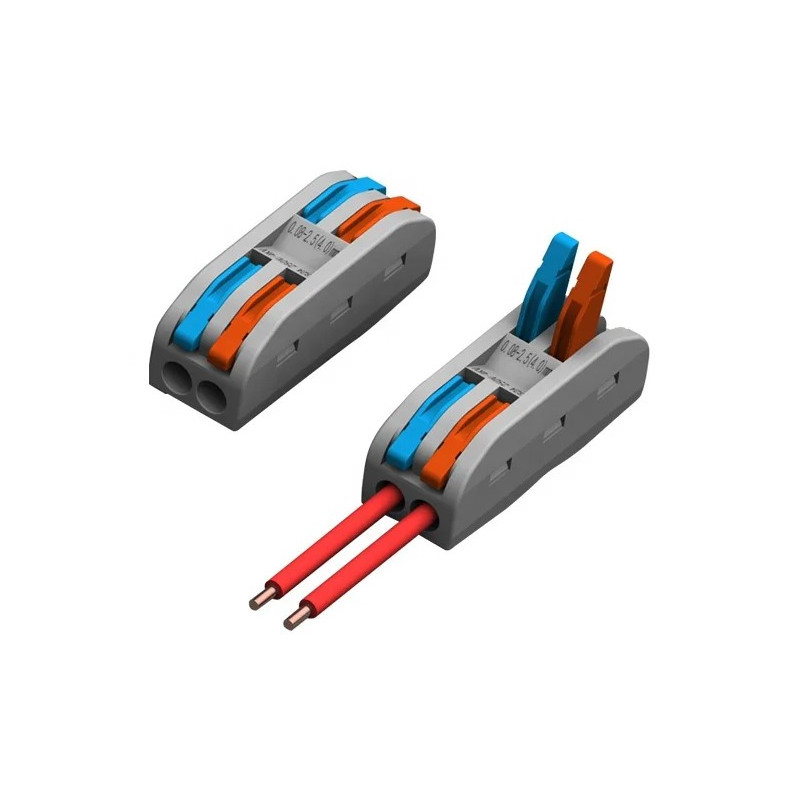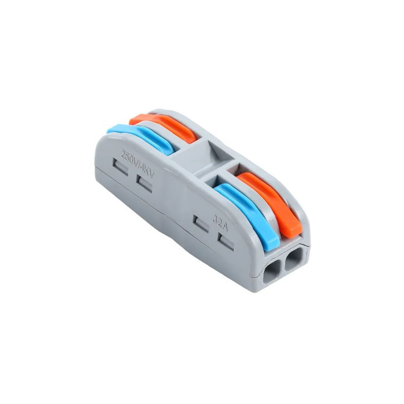 Svorka bezšroubová KM-2P-D-02, Obj. kód 73000030, která je určena pro spojení dvou dvoužilových vodičů nasunutím a zacvaknutím.