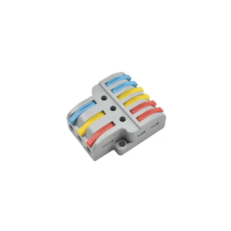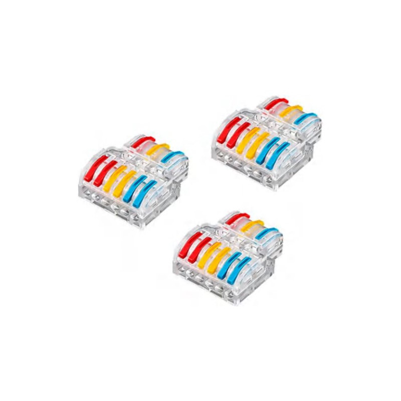Svorka bezšroubová KM-3Px2-D-02, Obj. kód 73000041, která je určena pro spojení tří třížilových vodičů nasunutím a zacvaknutím.