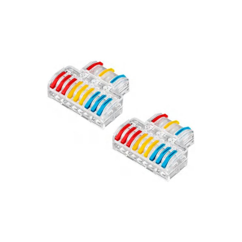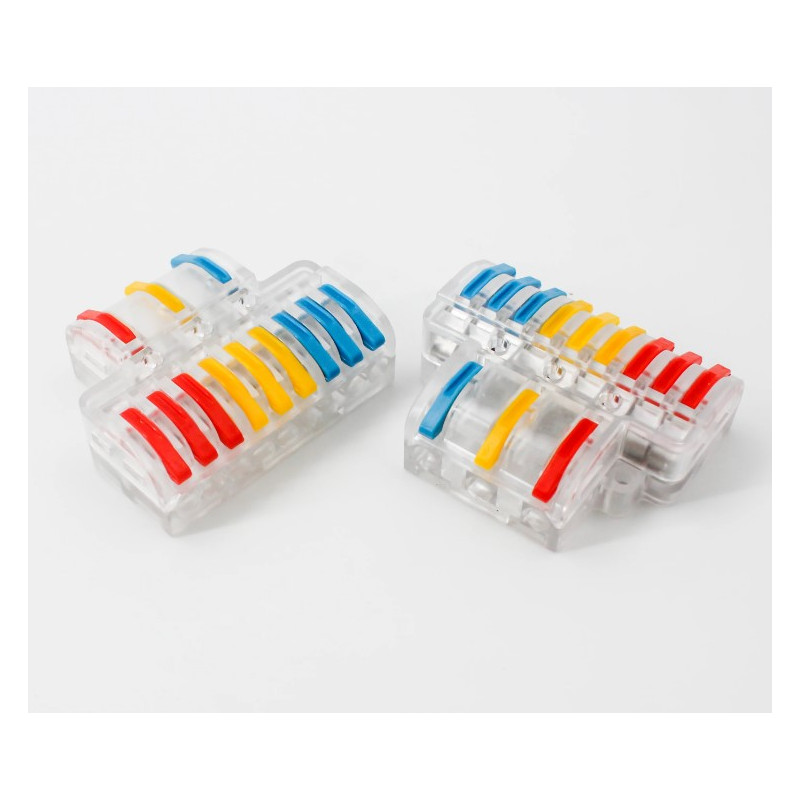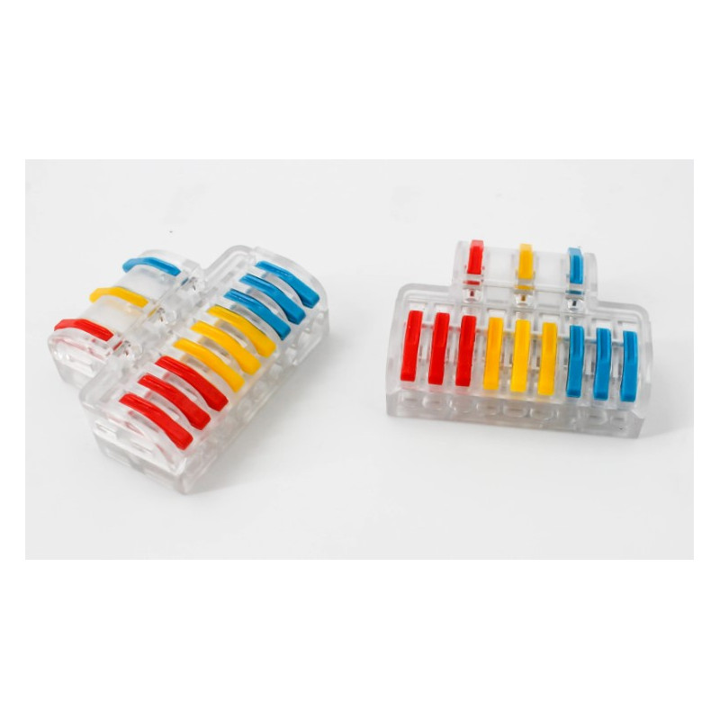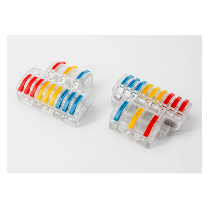 Svorka bezšroubová KM-3Px3-D-02, Obj. kód 73000042, která je určena pro spojení čtyř třížilových vodičů nasunutím a zacvaknutím.