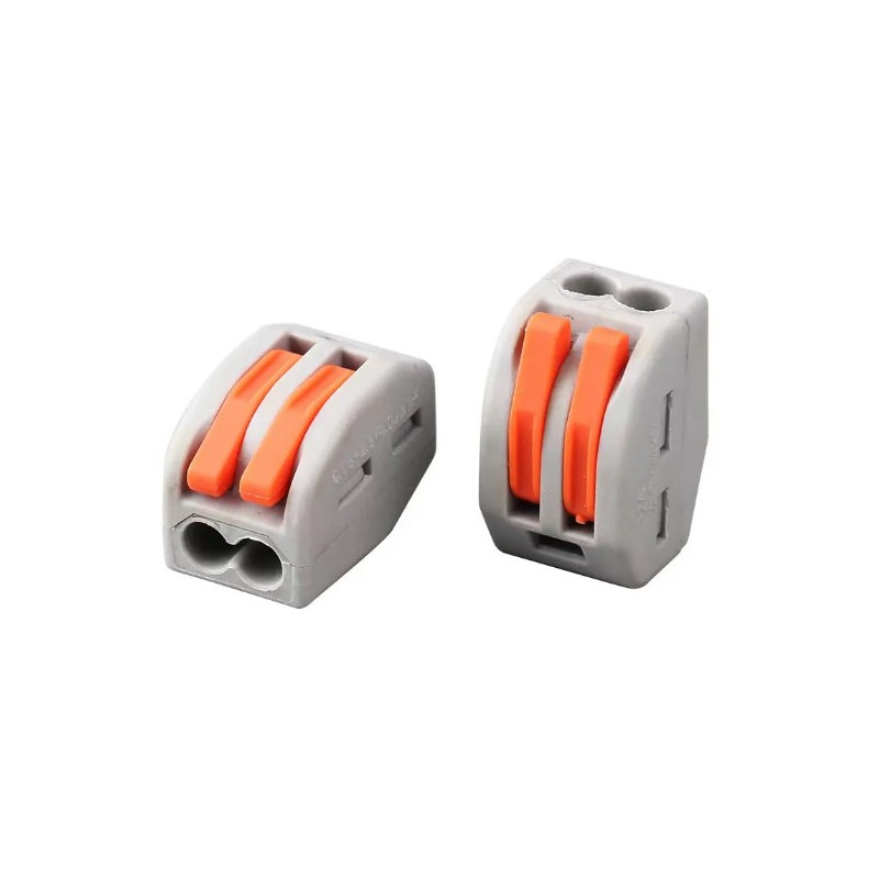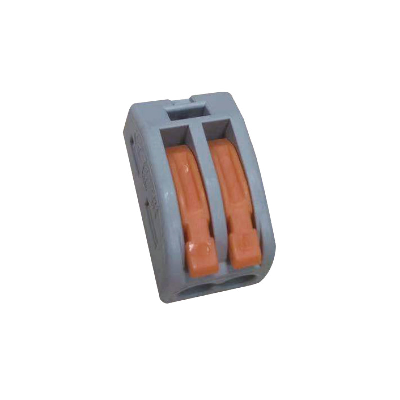 Svorka bezšroubová KM-2P-D-02, Obj. kód 73000030, která je určena pro spojení dvou dvoužilových vodičů nasunutím a zacvaknutím.