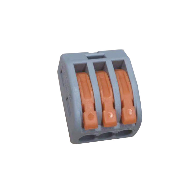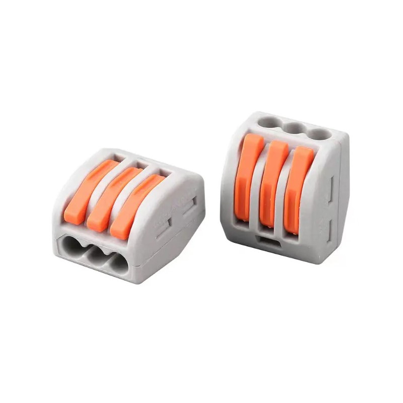 Svorka bezšroubová KM-3P-D-02, Obj. kód 73000031, která je určena pro spojení dvou třížilových vodičů nasunutím a zacvaknutím.