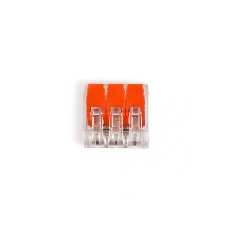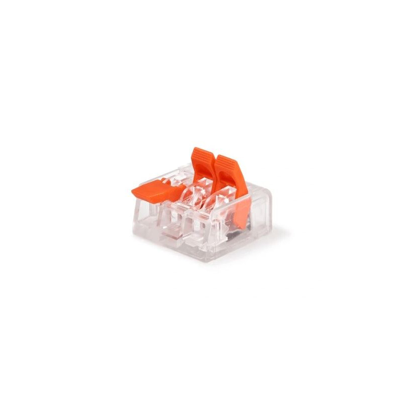 Svorka bezšroubová KM-3D-V-02, Obj. kód 73000063, která je určena pro spojení dvou vodičů nasunutím a zacvaknutím.