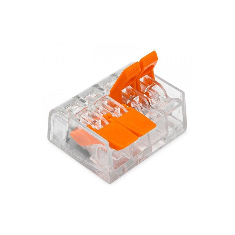 Svorka bezšroubová KM-2P-D-02, Obj. kód 73000030, která je určena pro spojení dvou dvoužilových vodičů nasunutím a zacvaknutím.
