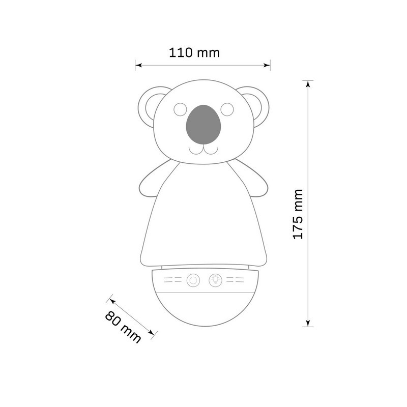 KOALA LED dětské svítidlo RGB+W Svítilna je dokonalou dekorací do dětského pokoje. Má dotykový spínač a ovladač úrovně a barev. Osmiúrovňové nastavení umožňuje nastavit jas a barvu světla. Doba svícení: Přibližně 4 hodiny při 100% bílém světle (110 lm) Přibližně 8 hodin při 50% bílém světle (55 lm) Doba nabíjení přibližně 2,5 hodiny. Doporučené napájení 5V, 1A - zdroj není součástí balení. Výrobek je určen k dekorativnímu osvětlení. Nevhodné pro osvětlení místností.