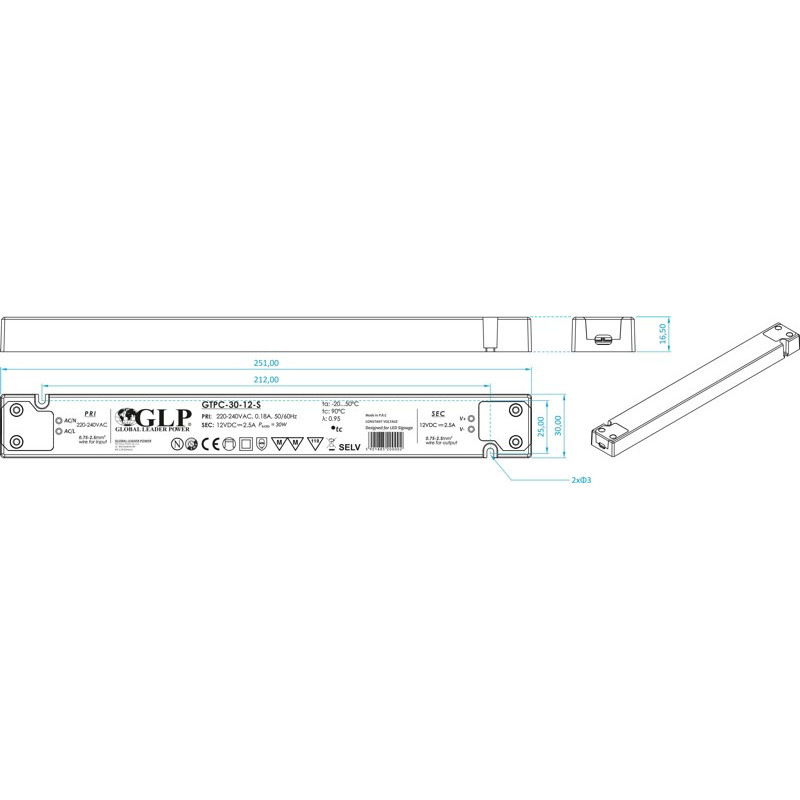 Napájecí zdroj 32610030 GTPC-30-12-S, instalační 30W slim, s konstantním napětím 12V DC na výstupu, vhodný pro napájení LED aplikací