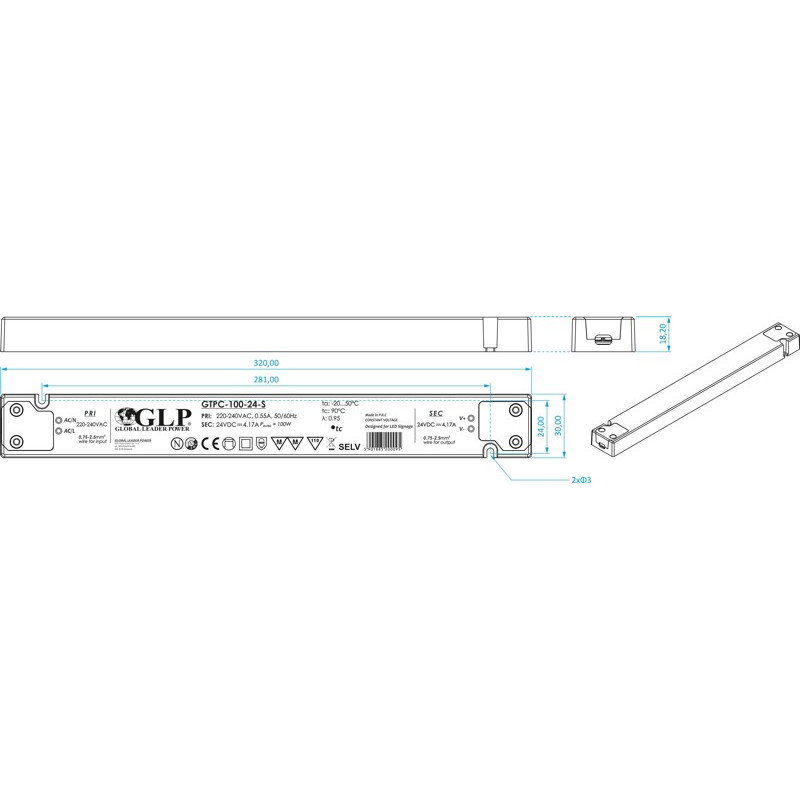 Napájecí zdroj 32620100 GTPC-100-24-S, instalační 100W slim, s konstantním napětím 24V DC na výstupu, vhodný pro napájení LED aplikací