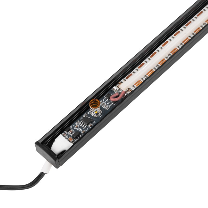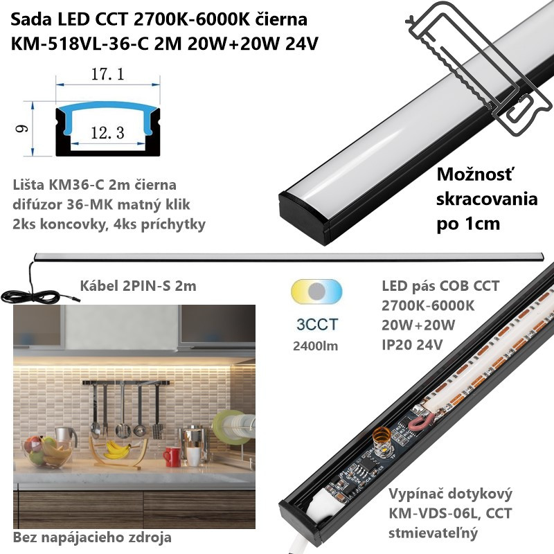 Sada LED CCT KM-518VL-36-C 2M 20W+20W 24V v čiernom farebnom prevedení, s napájacím napätím 24V DC, výkonom 20W+20W, nastaviteľnou farbou svetla CCT 2700K-6000K, svietivosťou 120lm/W, krytím IP20. Svietivosť a farbu svetla je možné nastaviť pomocou zabudovaného dotykového vypínača. LED sada má rozmer 9x17x2000mm, dĺžka napájacieho kábla 2PIN-S je 2000mm. LED sadu je možné podľa potreby krátiť na požadovaný rozmer s presnosťou na 1cm. Pri krátení LED sady zdemontujete koncovku na konci kde nie je napájací kábel, zdemontujete difúzor, odlepíte nepotrebnú časť LED pásu a odstrihnete ju nožnicami v mieste medených kontaktov, nacvaknete difúzor a pílou odrežete nepotrebnú časť lišty aj s difúzorom, namontujete koncovku. LED sada je určená na pov