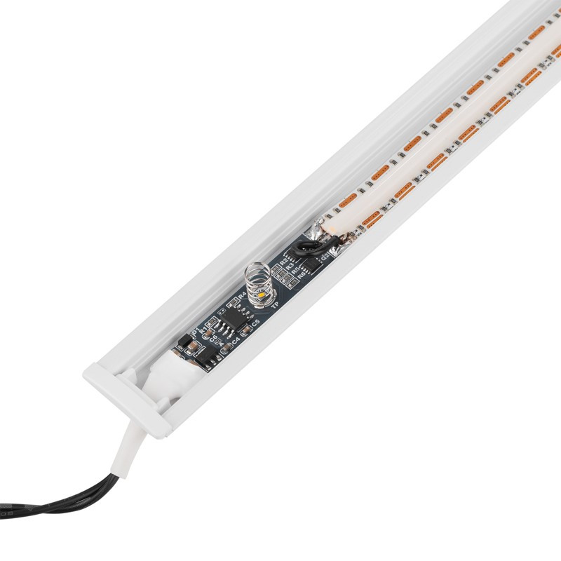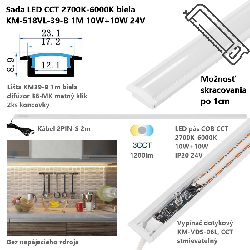 Sada LED CCT KM-518VL-39-B 1M 10W+10W 24V v bielom farebnom prevedení, s napájacím napätím 24V DC, výkonom 10W+10W, nastaviteľnou farbou svetla CCT 2700K-6000K, svietivosťou 120lm/W, krytím IP20. Svietivosť a farbu svetla je možné nastaviť pomocou zabudovaného dotykového vypínača. LED sada má rozmer 9x17x1000mm, dĺžka napájacieho kábla 2PIN-S je 2000mm. LED sadu je možné podľa potreby krátiť na požadovaný rozmer s presnosťou na 1cm. Pri krátení LED sady zdemontujete koncovku na konci kde nie je napájací kábel, zdemontujete difúzor, odlepíte nepotrebnú časť LED pásu a odstrihnete ju nožnicami v mieste medených kontaktov, nacvaknete difúzor a pílou odrežete nepotrebnú časť lišty aj s difúzorom, namontujete koncovku. LED sada je určená na zápu