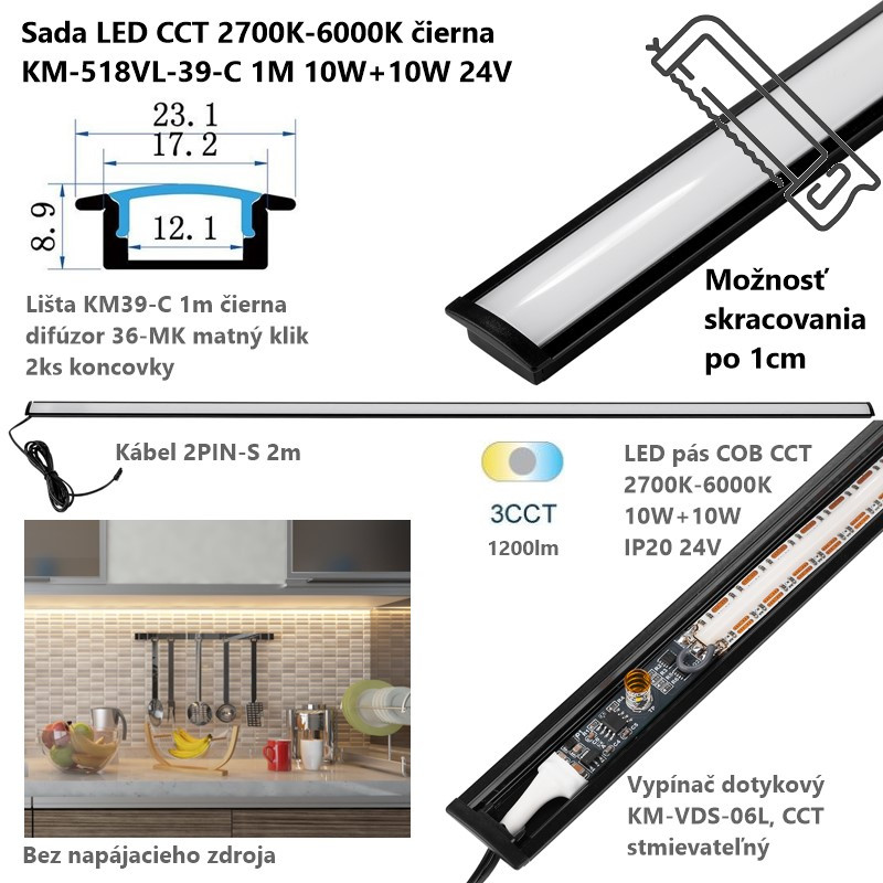 Sada LED CCT KM-518VL-39-C 1M 10W+10W 24V v čiernom farebnom prevedení, s napájacím napätím 24V DC, výkonom 10W+10W, nastaviteľnou farbou svetla CCT 2700K-6000K, svietivosťou 120lm/W, krytím IP20. Svietivosť a farbu svetla je možné nastaviť pomocou zabudovaného dotykového vypínača. LED sada má rozmer 9x17x1000mm, dĺžka napájacieho kábla 2PIN-S je 2000mm. LED sadu je možné podľa potreby krátiť na požadovaný rozmer s presnosťou na 1cm. Pri krátení LED sady zdemontujete koncovku na konci kde nie je napájací kábel, zdemontujete difúzor, odlepíte nepotrebnú časť LED pásu a odstrihnete ju nožnicami v mieste medených kontaktov, nacvaknete difúzor a pílou odrežete nepotrebnú časť lišty aj s difúzorom, namontujete koncovku. LED sada je určená na zá