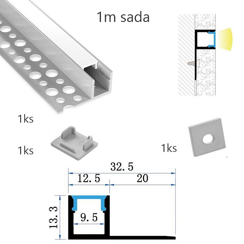 Sada lišty pro LED pásy KM65-S-MK-P 1m ve stříbrném barevném provedení o rozměrech 32x13,3x1000mm určená pro montáž k obkladům a dlažbám. Balení obsahuje: 1ks hliníkové lišty o délce 1m, 1ks matný difuzor o délce 1m, 1ks koncovky bez otvoru, 1ks koncovky s otvorem.