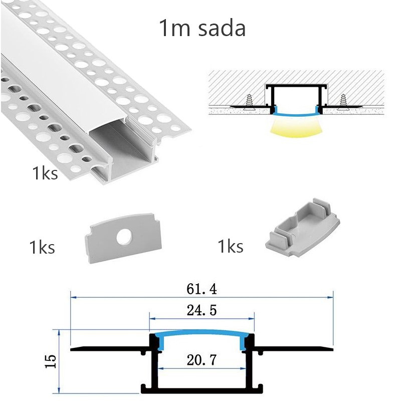 Sada lišty pro LED pásy KM81-S-MK-P 1m ve stříbrném barevném provedení určená pro montáž do sádrokartonu, o rozměrech 61,4x15x1000mm. Balení obsahuje: 1ks hliníkové lišty o délce 1m, 1ks matný difuzor o délce 1m, 1ks koncovky bez otvoru, 1ks koncovky s otvorem. Lišta se rozměrově vejde do tloušťky sádrokartonu a není třeba při montáži dávat pozor na rozmístění nosné konstrukce sádrokartonu.