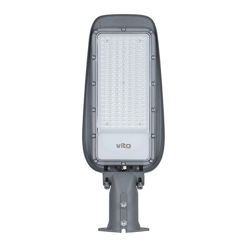 Svítilna veřejného osvětlení TIGER se zabudovaným LED zdrojem o výkonu 100W s barvou světla 4000K - neutrální bílá, svítivostí 12000lm, krytím IP65. Montáž na výložník D60mm. Svítilna má nastavitelný kloub se kterým lze doladit úhel instalace.