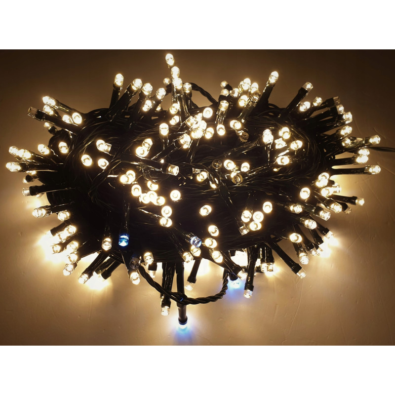 Vánoční řetěz 2-20-FLE WW+CW 20M s délkou 20m+1,5m napájecí kabel v barevném provedení zelená, obsahuje 400ks LED v barvě světla teplá bílá s efektem FLASH problikávání studené bílé, určená pro dekorační osvětlení interiérů i exterié 220-240V.