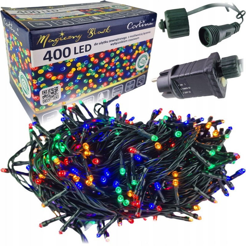 Vánoční řetěz 642-21-LED T WW 20M s délkou 20m+1,5m napájecí kabel v barevném provedení zelená, obsahuje 400ks LED v barvě světla multikolor, určený pro dekorační osvětlení interiérů i exteriérů s krytím IP44 a napájecím napětím 220. Obsahuje timer pro režim automatického zapnutí/vypnutí a propojovací konektor - možnost spojit Max. tři řetězy.