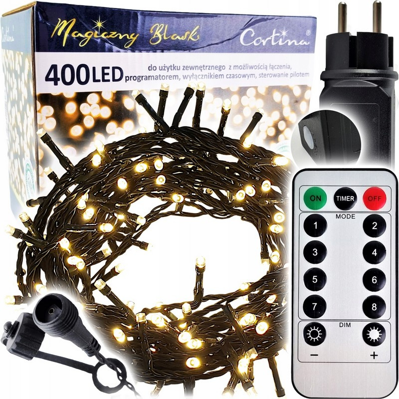 Vánoční řetěz 644-21-LED RC WW 10M s délkou 20m+1,5m napájecí kabel v barevném provedení zelená, obsahuje 400ks LED v barvě světla teplá bílá, určená pro dekorační osvětlení interiérů i exteriérů s krytím IP44, napájecím napětím2 Max. tří řetězů do jednoho celku. Řetěz lze ovládat dálkovým ovladačem, obsahuje také timer pro režim automatického vypnutí a zapnutí.