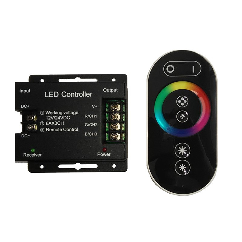 Controller KM-RGB-15, se vstupním/výstupním napětím DC 12-48V, proudem 36A, vhodný pro ovládání RGB LED pásů s možností nastavení intenzity a barvy světla. Controller se ovládá pomocí dálkového ovladače. Přenos signálu je radiofrekvenční.