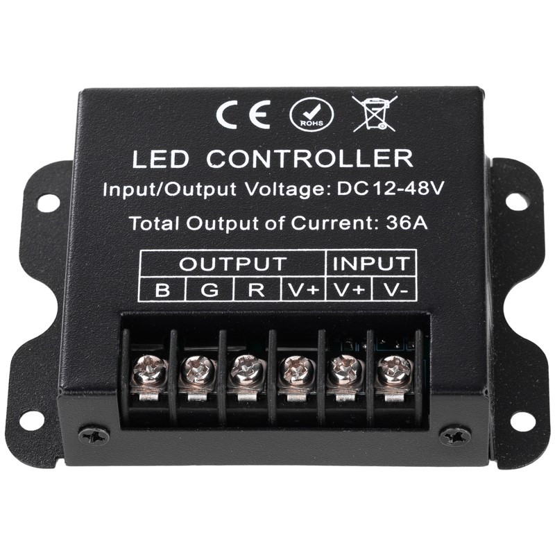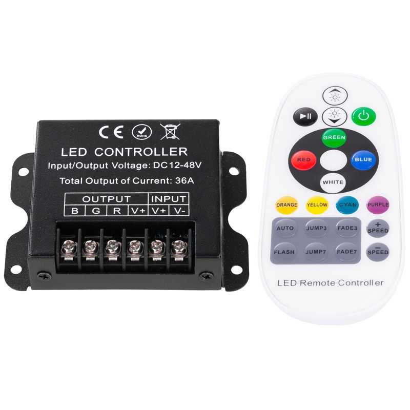 Controller KM-RGB-15, se vstupním/výstupním napětím DC 12-48V, proudem 36A, vhodný pro ovládání RGB LED pásů s možností nastavení intenzity a barvy světla. Controller se ovládá pomocí dálkového ovladače. Přenos signálu je radiofrekvenční.