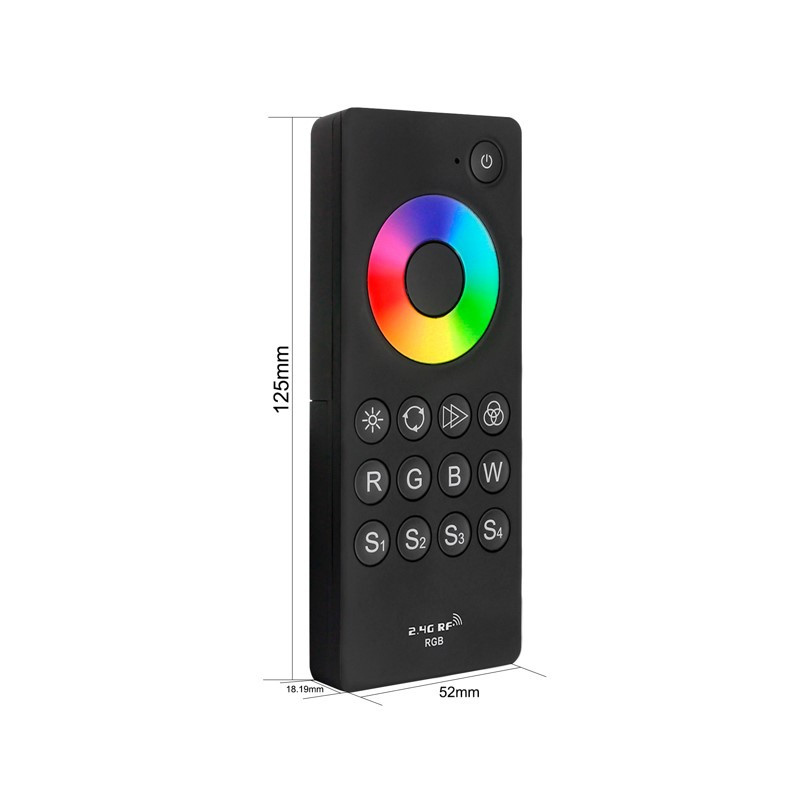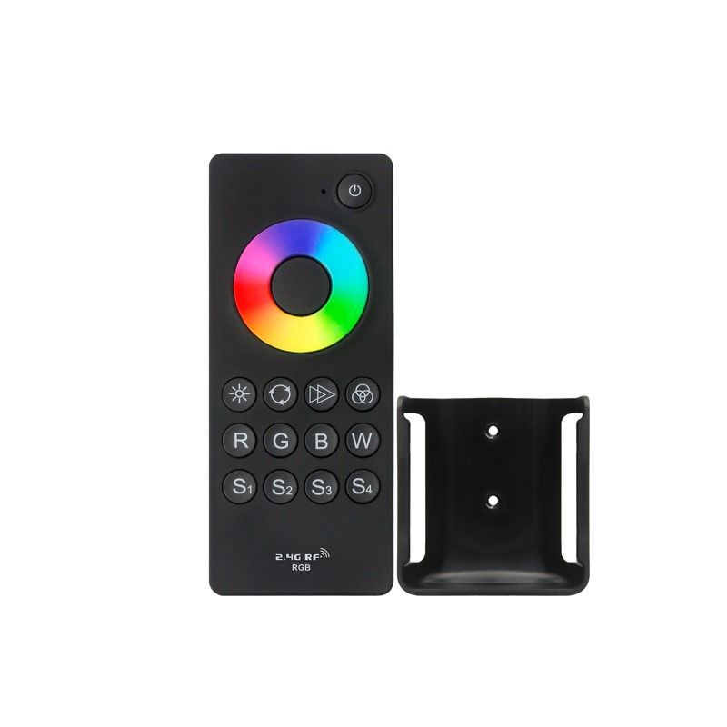 Controller ovládač KM-RGB-UNI-3 obj. kód 38134563 s RF prenosom, určený pre ovládanie RGB LED pásov. Ovládač je kompatibilný s prijímačom KM-1220-UNI obj. kód 38134550 12V/180W 24V/360W. Prijímač je nastavený na univerzálnu frekvenciu pri ktorej reaguje na všetky ovládače, ak ho spárujeme pomocou párovacieho tlačítka s konkrétnym diaľkovým ovládačom na iné už nebude reagovať. Pomocou tohto ovládača môžete LED pás zapnúť/vypnúť, plynule meniť statickú farbu svetla, nastaviť farbu svetla a svietivosť priamo pomocou tlačidiel, spustiť rôzne dynamické programi a uložiť do pamäte S1, S2, S3, S4 štyri rôzne nastavenia. Súčasťou balenia je držiak ovládača do ktorého sa môže ovládač uložiť.
