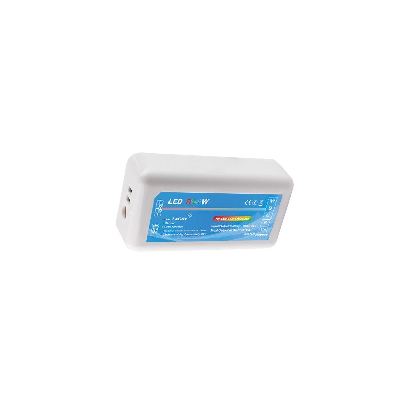 RGB+W 4zónový přijímač KM-RGBW-4Z-21, 4x4A 12V/192W 24V/384W s RF přenosem, slouží k ovládání RGB+W pásů s možností nastavení různých statických barev světla vč. samostatné bílé, nebo spuštění více dynamických programů. Při nastavení statické barvy lze zvýšit/snížit intenzitu osvětlení, při spuštěném programu lze zvýšit/snížit rychlost programu. Používá se v kombinaci se 4-zónovým RGBW ovladačem, kde na jeden ovladač lze napárovat až 40ks těchto přijímačů