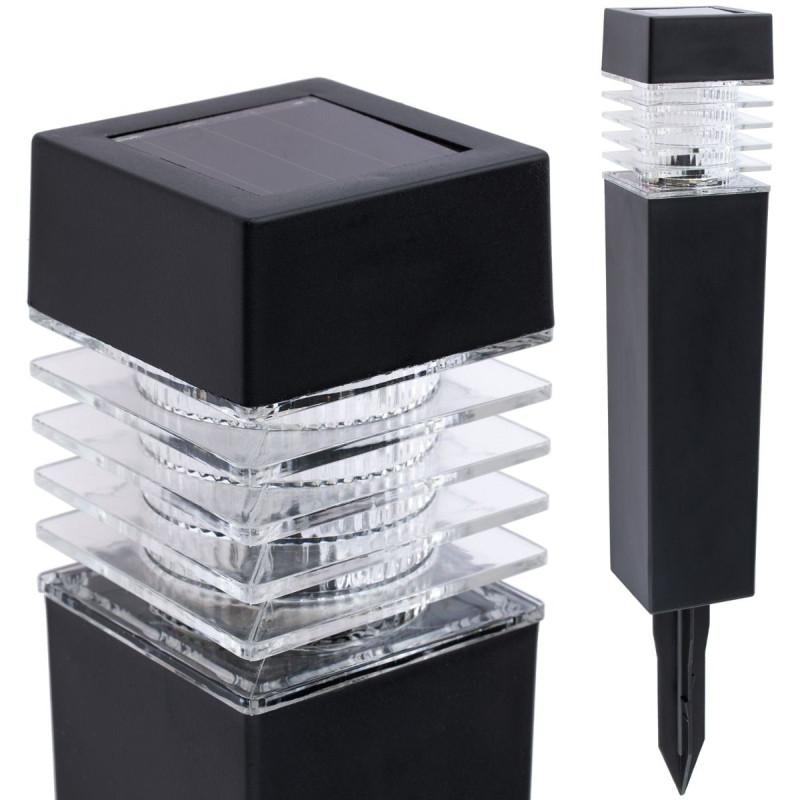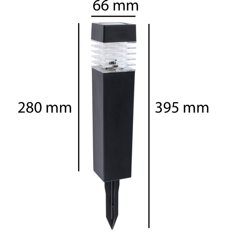 SOLUX-S je solární vodotěsné, IP44, zahradní svítidlo vybavené SMD LED diodami a fotosenzorem. Transparentní polykarbonátový difuzor o tloušťce 4 mm. Pouzdro z ABS v černé barvě. Polykarbonátový solární panel. Polykrystalický panel 2V - 0,09W. Baterie: 18650 3,7V 1500mAh Doba nabíjení: 6-8h Svícení: 6-8h Funguje s fotosenzorem, automaticky se zapne při lux<5 a vypne při lux>5.