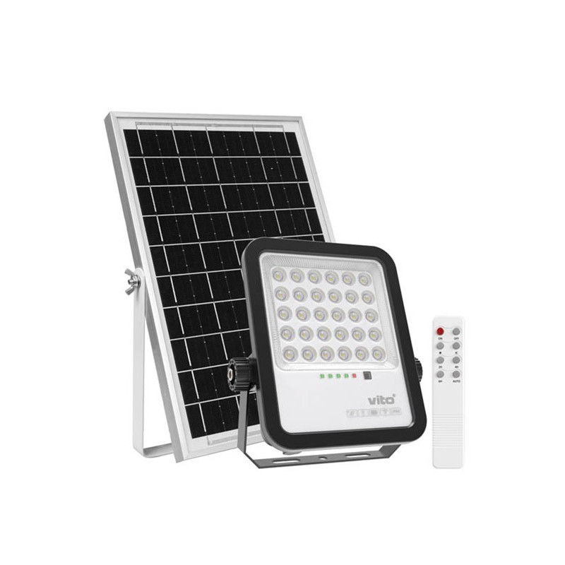 SAHARA-100W 6000K je solární vodotěsný reflektor IP65 vybaven SMD LED diodami a fotosenzorem. Průhledný difuzor. Tělo z ABS v černé barvě, polykarbonátový solární panel a sklo. Monokrystalický panel 5V – 10W. Baterie: Lithiová 2xLiFePO4 3,2V 8000mAh, Životní cykly > 1200, Doba nabíjení: 6-8h Autonomie: 12-14h Je vybavena dálkovým ovladačem s následujícími funkcemi: ON - svítivost 100%, světlo zhasne. OFF - Světlo vypnuto. Vysoká svítivost - Tlačítko je účinné, když je světlo zapnuto, svítivost se nastaví na 165 % a světlo zhasne po 3 hodinách. Mírná svítivost - Tlačítko je účinné, když je světlo zapnuto, svítivost se nastaví na 35% a světlo zhasne po 12-14 hodinách. 2H - Udržujte svítivost na 165%, světlo se vypne po 2 hodinách. 4H - Svítivost se nastaví na 100 %, světlo se vypne po 4 hodinách. 6H - Svítivost se nastaví na 100 %, světlo se vypne po 6 hodinách. AUTO - Svítivost se nastaví na 100%, světlo se vypne po 12-14 hodinách.