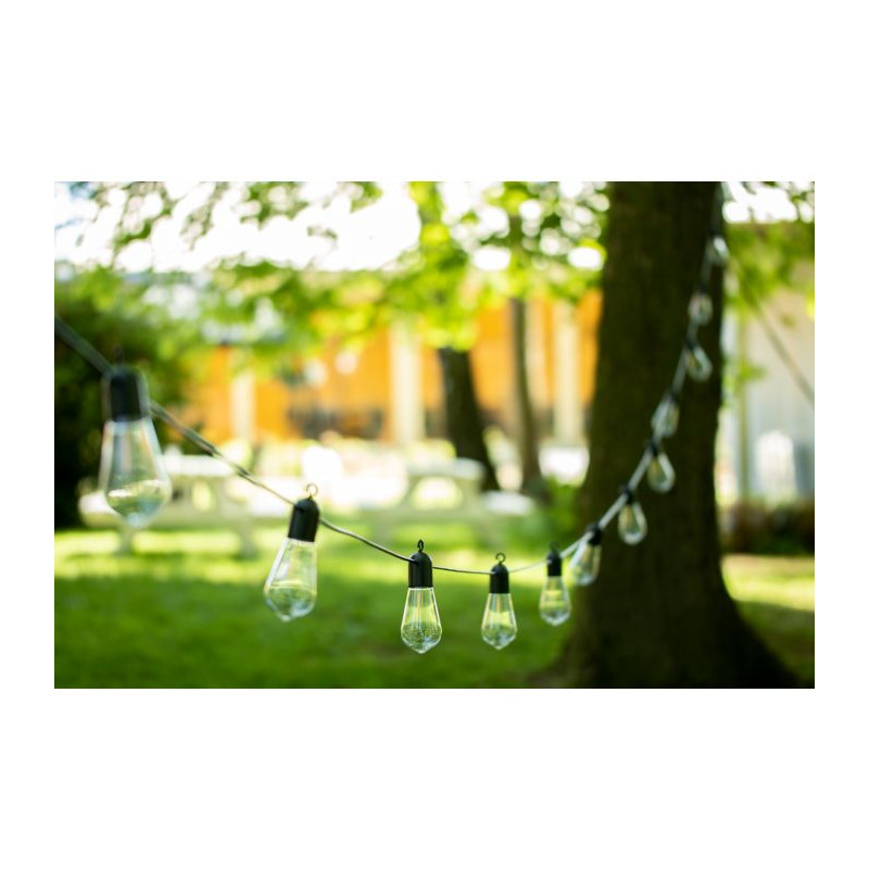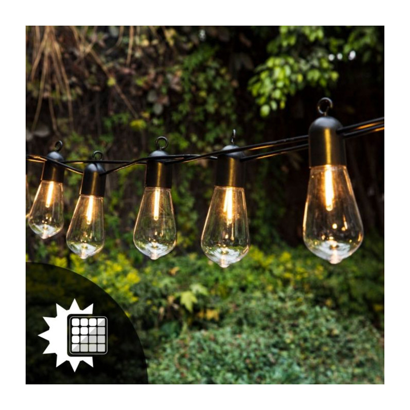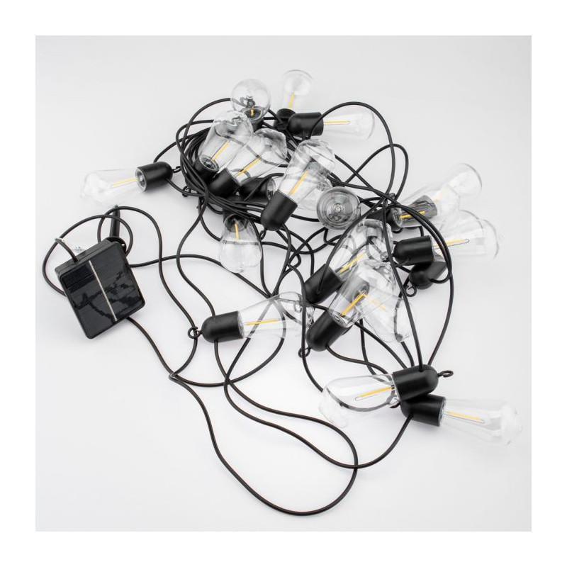 Solární svítidlo GIRLANDA EREMI 20LED s celkovou délkou 11,48m, délka svítící části 9,65m s krytím IP44 vhodné do exteriérů, barva světla teplá bílá, doba svícení při plném nabití 8h.