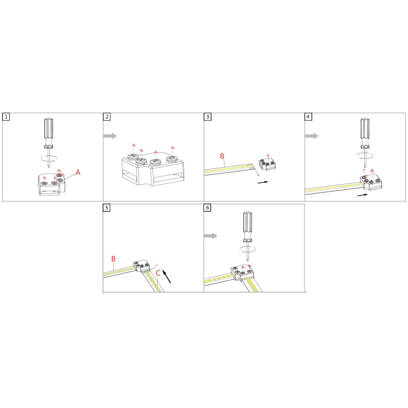 Spojka rohová KM-10A-2PL, obj. kód 20000217, která je určena pro rohové spojení 2pin LED pásů šířky 8-10mm nasunutím a šroubováním.