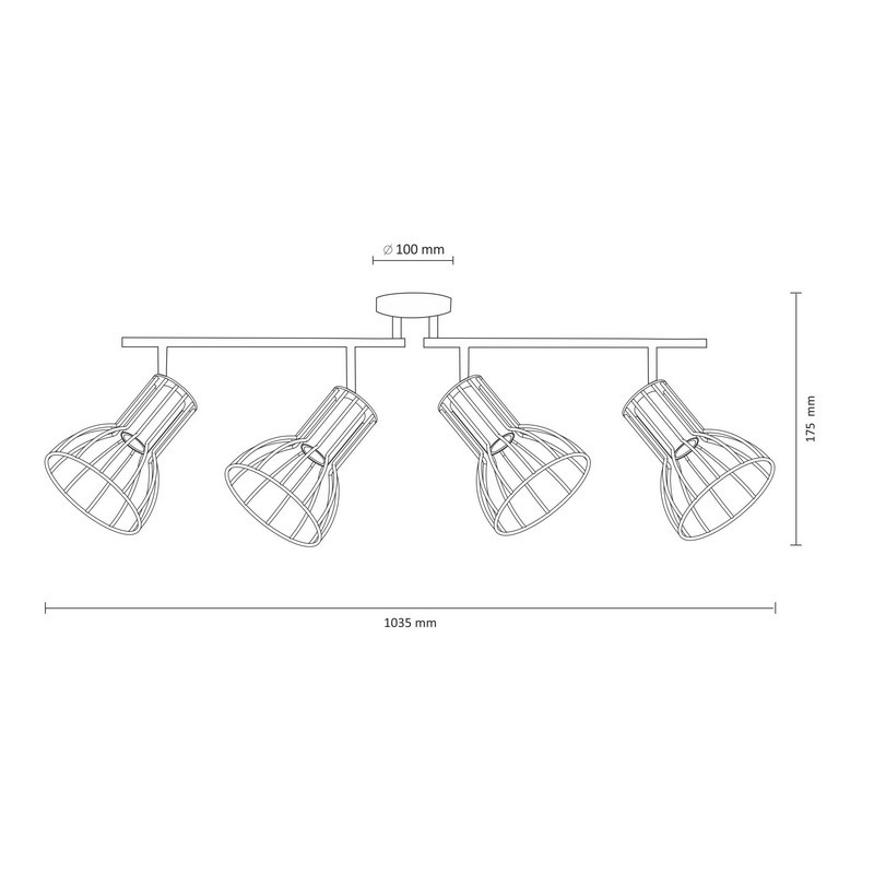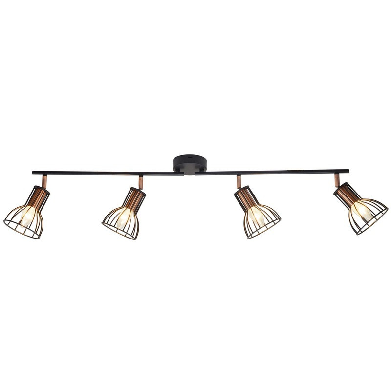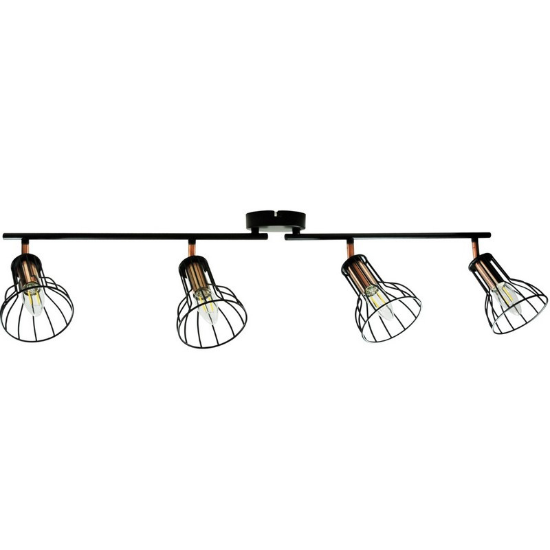 SOFIA je moderní svítilna, čtyřbodová stropní lišta v industriálním (loftovém) stylu, vyrobená z matného černého kovu s měděnými prvky. Doplňující informace: Svítilna se prodává bez světelného zdroje.