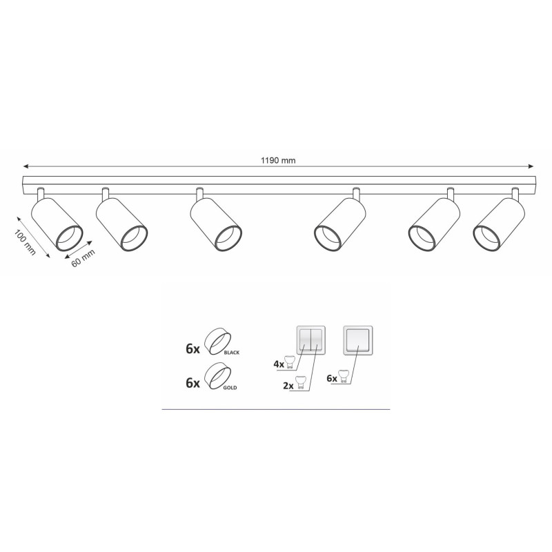 Svítilna MARIBEL 6xGU10 s výkonem maximálně 6x10W, krytím IP20, v černém barevném provedení, v balení je černý i zlatý dekorační prstenec, vhodné pro osvětlení interiérů.