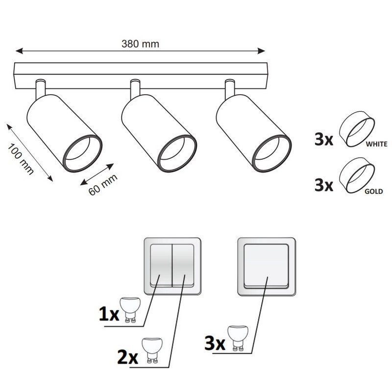 MARIBEL je tříbodové, moderní svítidlo s vyměnitelným zdrojem světla, vyrobené z bílého hliníku. Osazení má šest obrouček – tři bílé, tři zlaté. Přiložené hmoždinky a šrouby pro montáž svítidla jsou určeny pro pevné povrchy (beton, plná cihla). K připevnění svítidla vždy používejte upevňovací prvky, které jsou vhodné pro stěny ve vaší domácnosti. Doplňující informace: Svítilna se prodává bez světelného zdroje. Sada obsahuje: osazení + 6 prstenů (3 bílé, 3 zlaté)