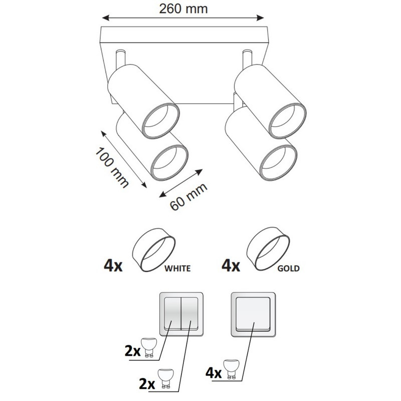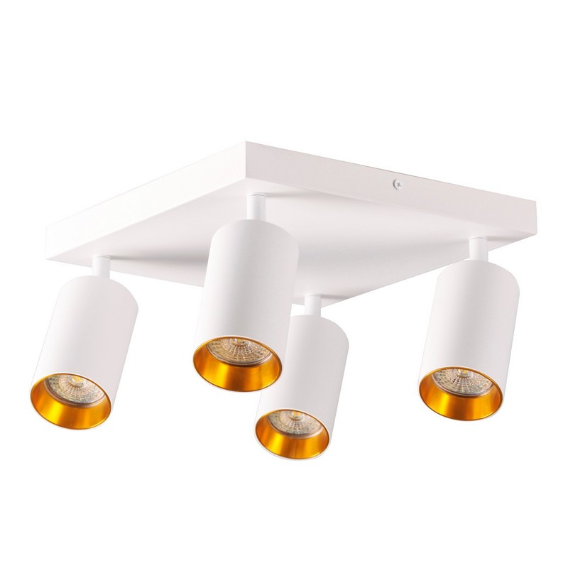 MARIBEL je čtyřbodové, moderní stropní svítidlo s nastavitelným, vyměnitelným zdrojem světla, vyrobeno z bílého hliníku. Rám má osm kroužků - čtyři bílé, čtyři zlaté. Přiložené hmoždinky a šrouby pro montáž svítidla jsou určeny pro pevné povrchy (beton, plná cihla). K připevnění svítidla vždy používejte upevňovací prvky, které jsou vhodné pro stěny ve vaší domácnosti. Doplňující informace: Svítilna se prodává bez světelného zdroje. Sada obsahuje: osazení + 8 prstenů (4 bílé, 4 zlaté)