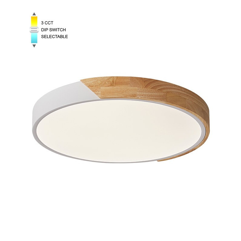 Svítidlo FINESSE R2-45 D50 LED 45W CCT-DIP WHT+WOOD v barevném provedení bílá + dřevo s nastavitelnou barvou světla, určené pro osvětlení interiérů. Pomocí přepínače DIP můžete nastavit barvu světla na tři hodnoty 3000K/4000K/6000K - teplá/neutrana/studená.