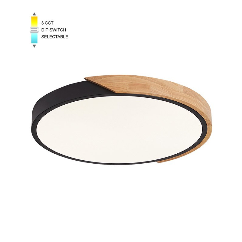 Svítilna FINESSE R2-45 D50 LED 45W CCT-DIP BLC+WOOD v barevném provedení černá+dřevo s nastavitelnou barvou světla, určené pro osvětlení interiérů. Pomocí přepínače DIP můžete nastavit barvu světla na tři hodnoty 3000K/4000K/6000K - teplá/neutrana/studená.