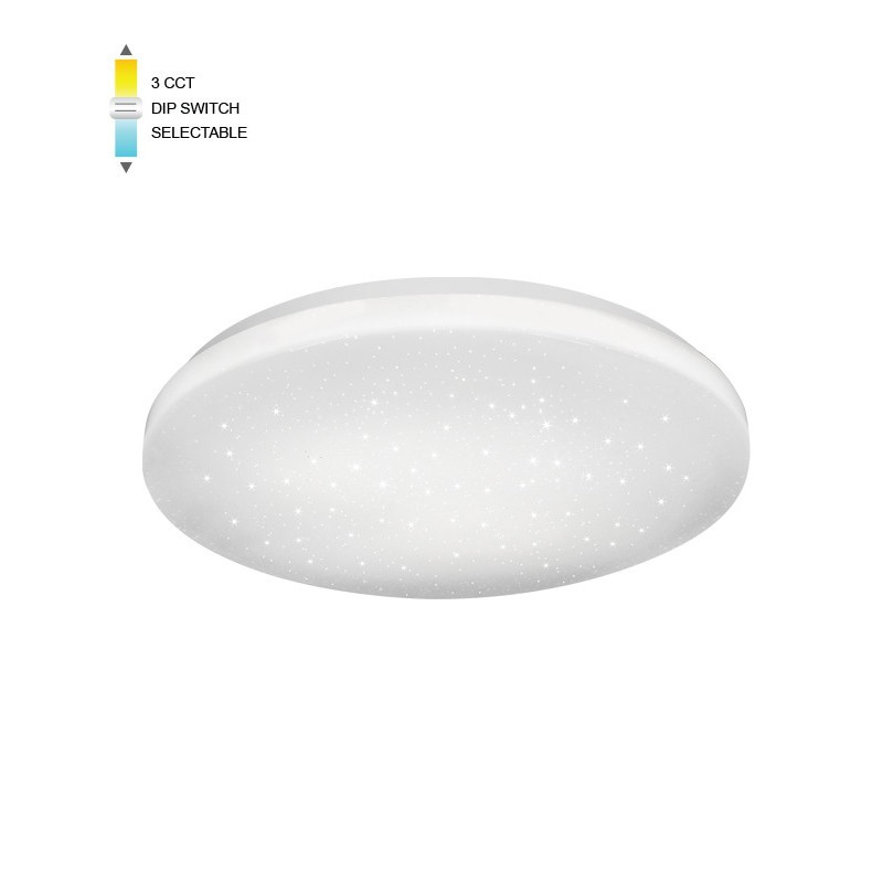 Svítilna COSMOS-R 24W LED CCT o rozměrech D350x55mm v bílém barevném provedení s nastavitelnou barvou světla 3000K-4000K-6500K, s efektem hvězdné nebe, určené pro osvětlení interiérů.