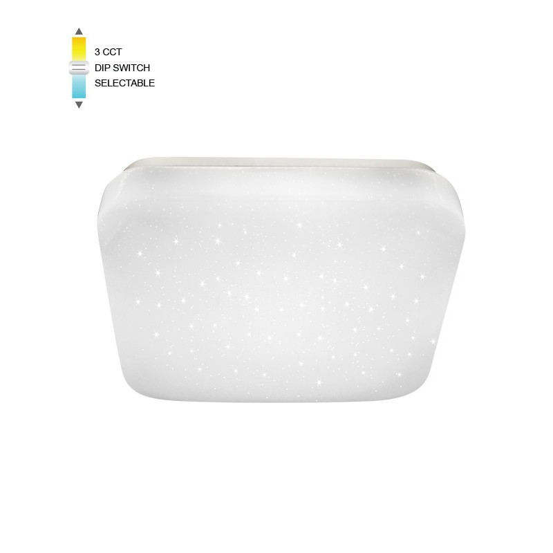 Svítilna COSMOS-S 12W LED CCT o rozměrech 275X275x60mm v bílém barevném provedení s nastavitelnou barvou světla 3000K-4000K-6500K, s efektem hvězdné nebe, určené pro osvětlení interiérů.